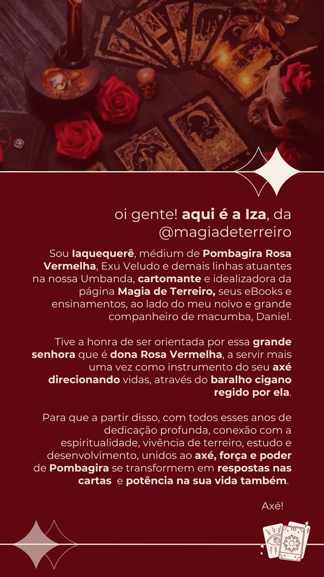 Magia de Terreiro surgiu através do direcionamento da nossa própria espiritualidade. Um casal do axé que entre muitos anos de terreiro vivendo experiências, curas, realizações, dores e superações, sempre movidos pela fé, sentindo e experenciando a espiritualidade como base, tiveram suas vidas transformadas quando se depararam a intimidade e conexão mais profunda com Exu Orixá e os Guardiões da Esquerda, Exu, Pombagira e Exu Mirim. Se viram diante de uma, se não a maior potência que atuava e os guiava em suas caminhadas, vidas, reviravoltas e decisões, e desde então vivem o movimento dessa grande potência em seu dia a dia. Magia de Terreiro, traz em seus eBooks os ensinamentos e fundamentos passados pelos nossos mais velhos, pelas entidades e pela espiritualidade, e assim, transmite axé, fundamentos, ensinamentos e auxilia quem busca o mesmo, mas acima de tudo uma das formas de amor, gratidão e devoção à Exu, Pombagira, Exu Mirim e toda a espiritualidade.
